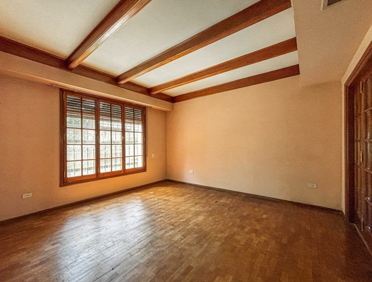 En planta baja, un importante hall de recepción da paso a un living y comedor independientes, ambos con detalles nobles y materiales de categoría. Se suma un comedor diario, cocina independiente, escritorio, family room o jardín de invierno con vistas abiertas al parque, baño de servicio y lavadero independiente. El sector exterior ofrece un gran jardín parquizado con piscina equipada, quincho con parrillero y cochera para tres vehículos con portón automatizado.