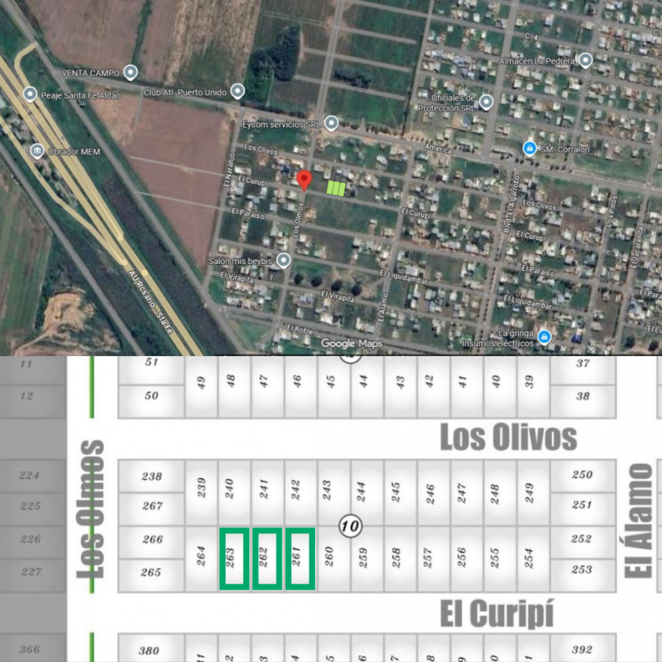 Tres lotes disponibles de 288 m² cada uno, ubicados en Manzana 10 (Lotes 261, 262 y 263).