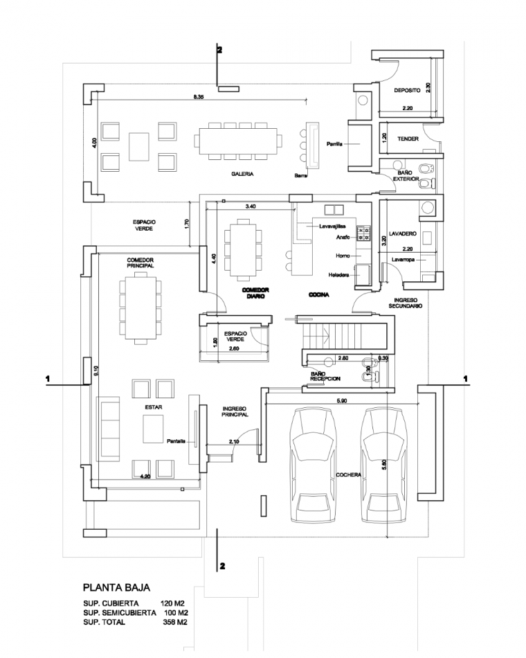 Desarrollada sobre un lote de 800 m², la casa cuenta con una superficie total construida de 358 m², con amplios espacios interiores y áreas semicubiertas que se integran de manera armónica con el jardín y la piscina.