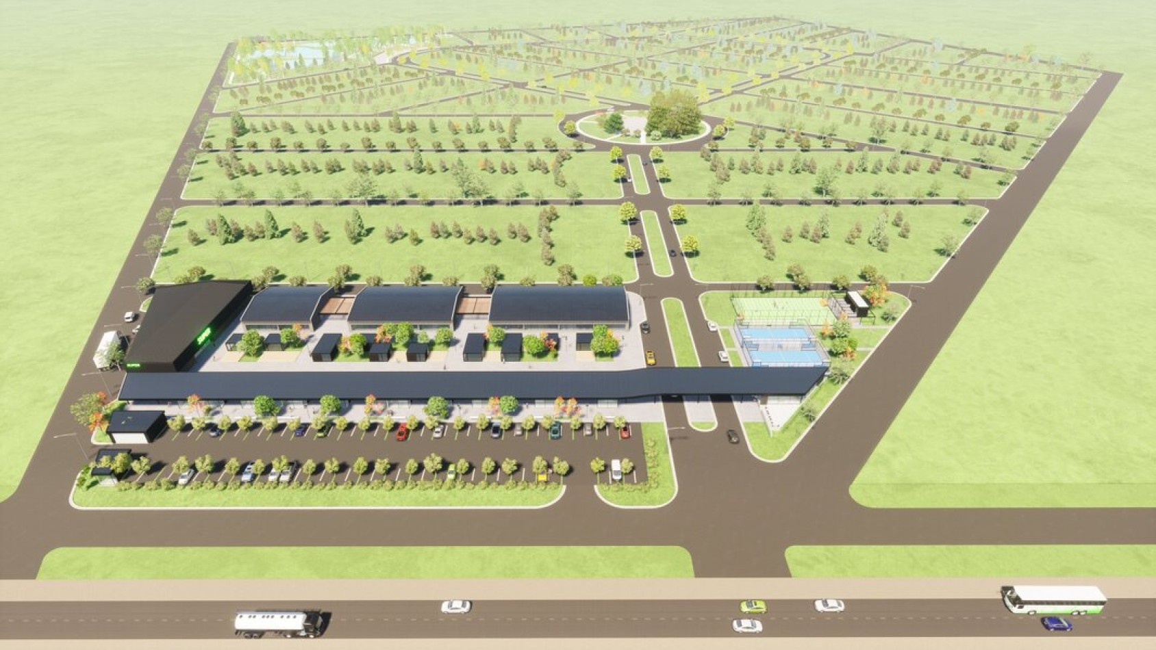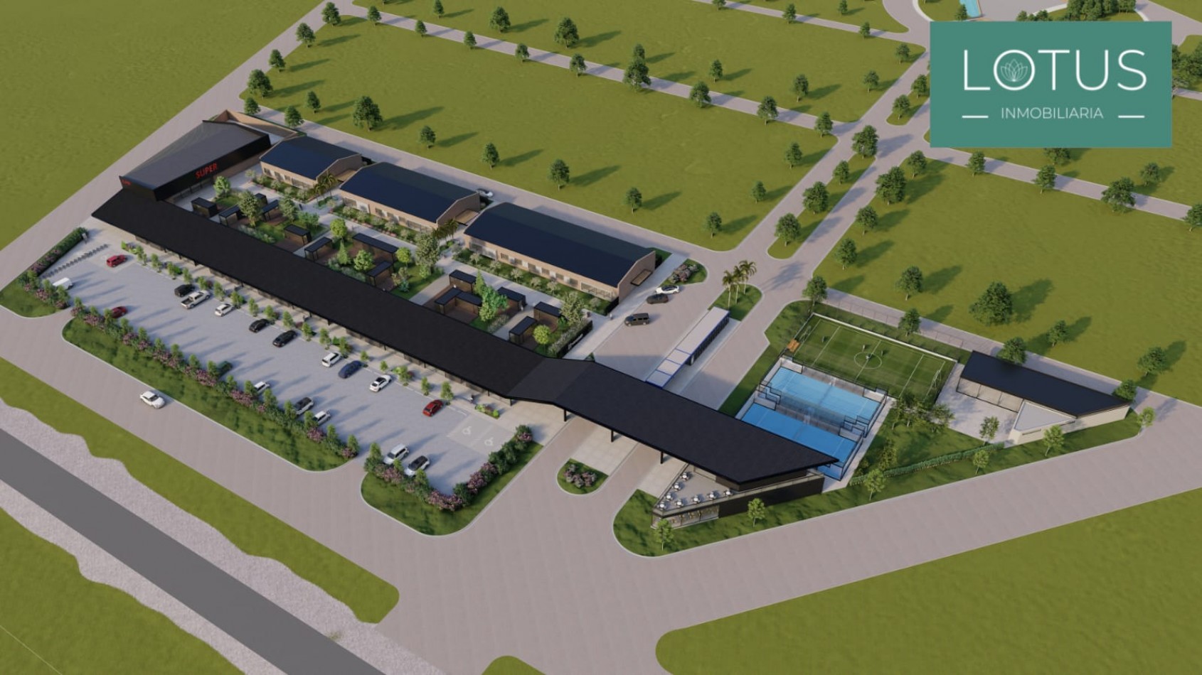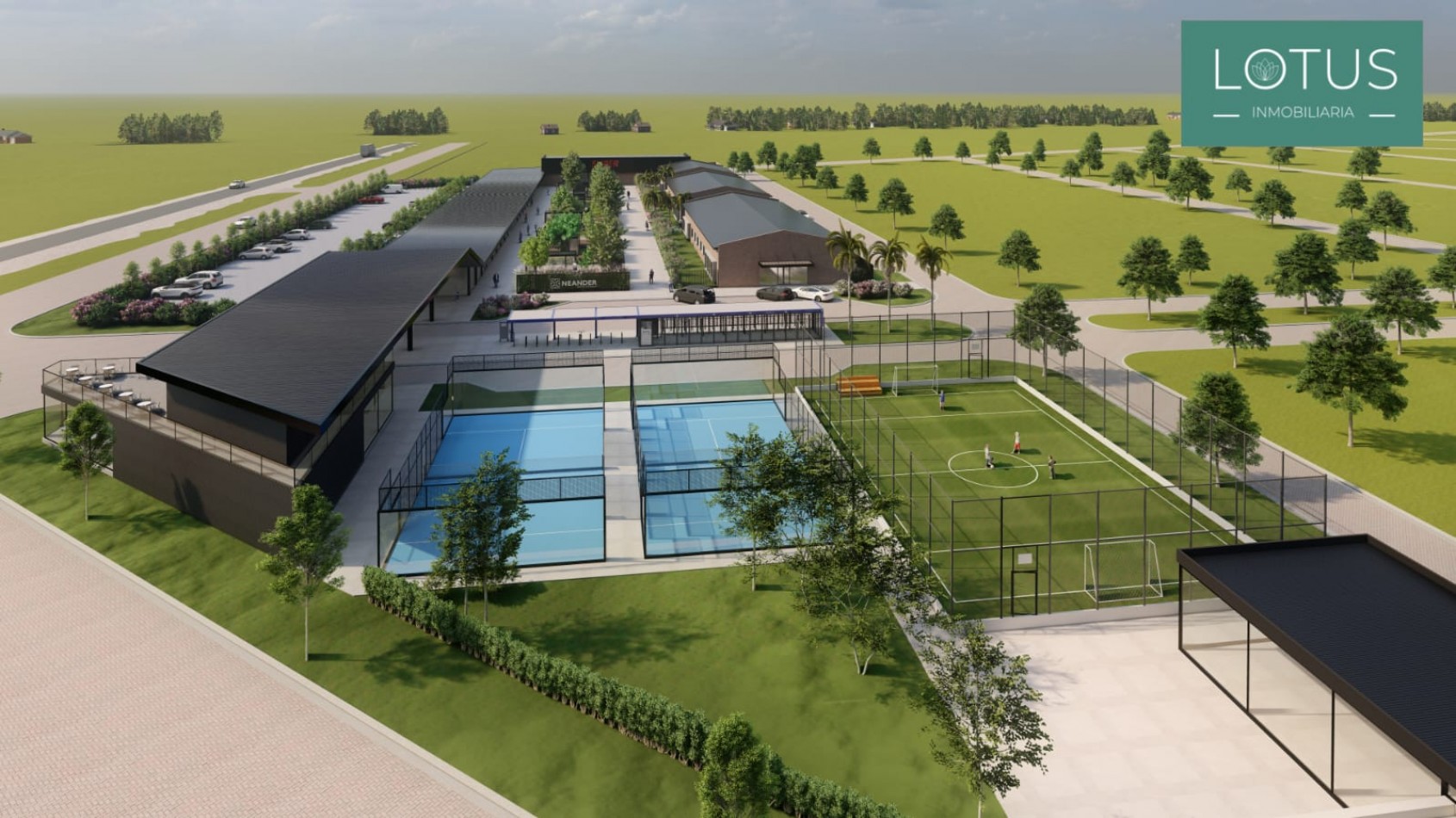 - Desarrollo de Área Deportiva: 2 canchas de paddle, 1 cancha de tenis, 1 cancha de fútbol 7.