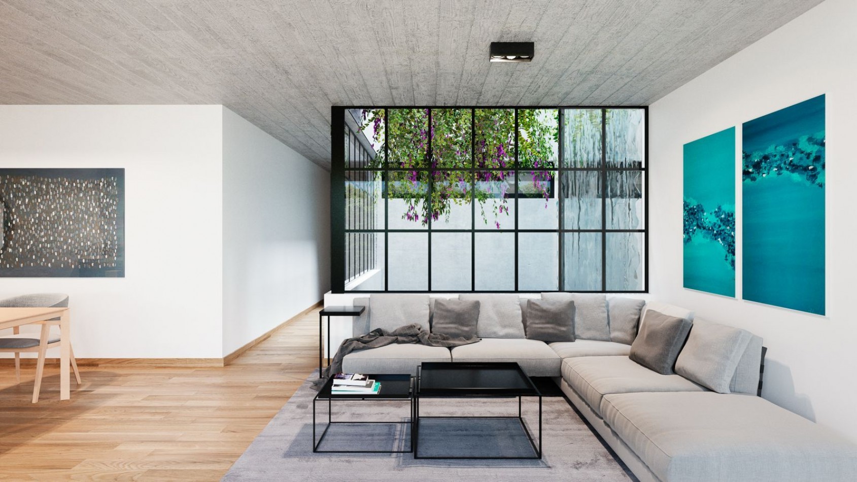 Pisos porcelanatos símil madera en espacios comunes, aberturas de aluminio negro con DVH.
