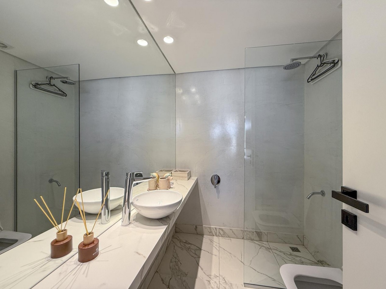 Calidades premium con una estructura de hormigón visto y maceteros verdes más riesgo artificial, aberturas de alta prestación en aluminio con DVH, pisos de madera de ingeniería en combinación con porcelanato para espacios húmedos, agua caliente central y climatización por aire con equipos VRV más losa radiante eléctrica en los baños, mucho espacio de guardado con placares terminados con interiores colocados, cocinas de diseño íntimo, mesadas de silestone, horno y anafes eléctricos diferenciados, bacha de acero inoxidable y mobiliario completo de piso a techo con bajo mesada más alacenas. Baños con loza sanitaria y griferías de primeras marcas, bañera o duchador, espejo colocado.