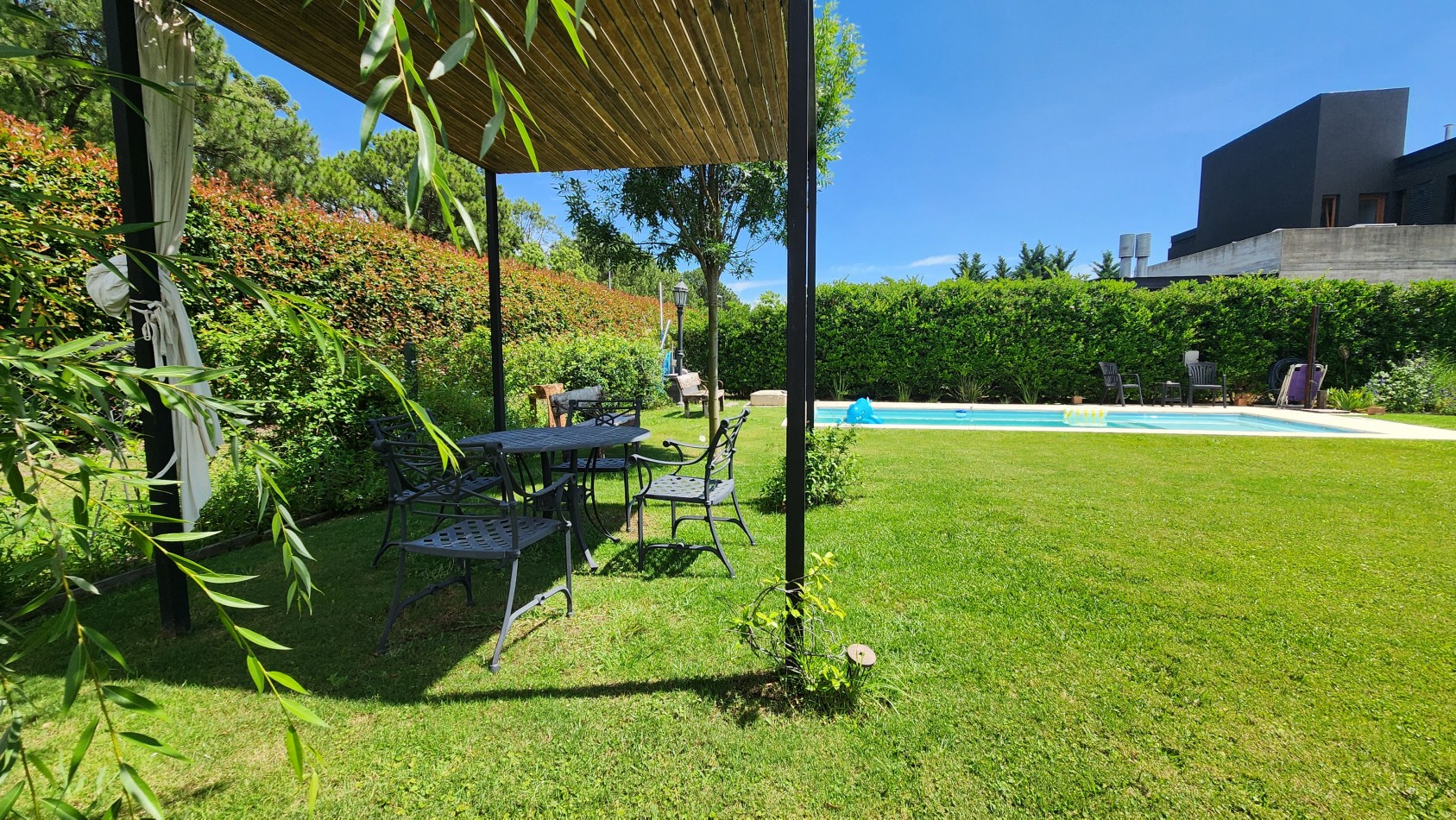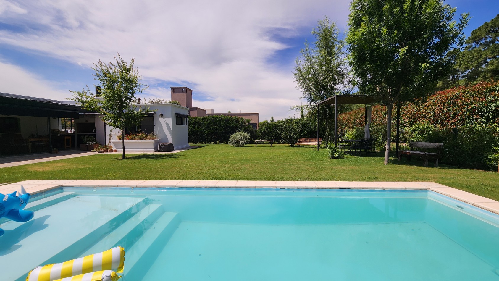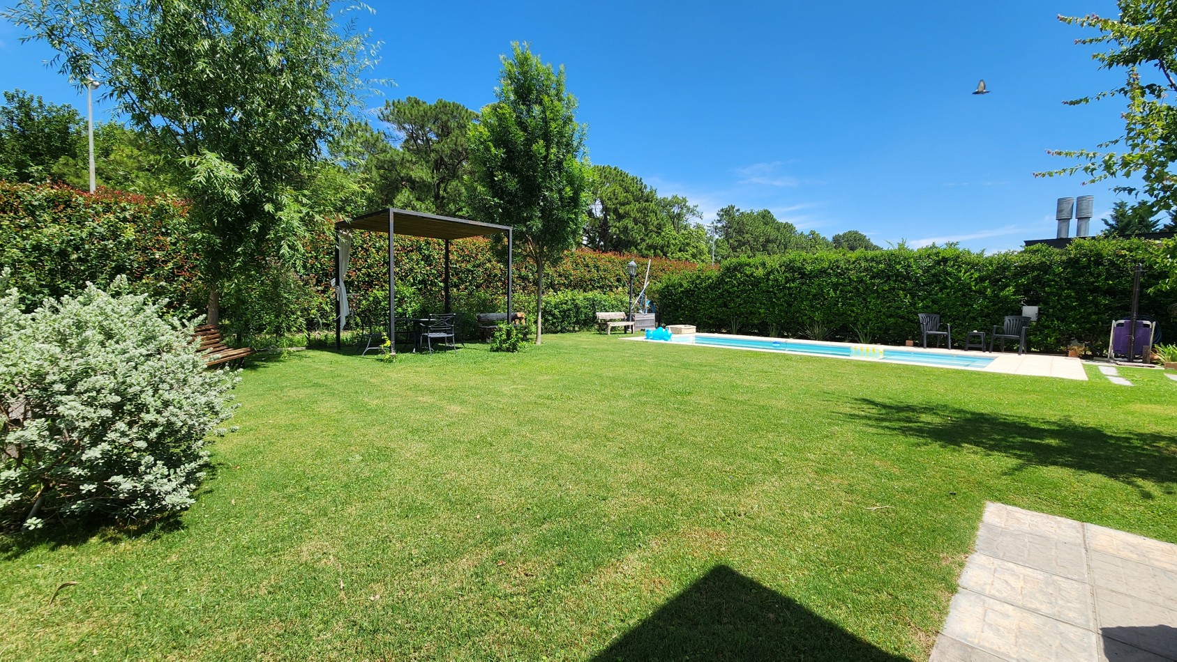 Afuera un amplio jardín con frondosa y desarrollada vegetación rodean la pileta.