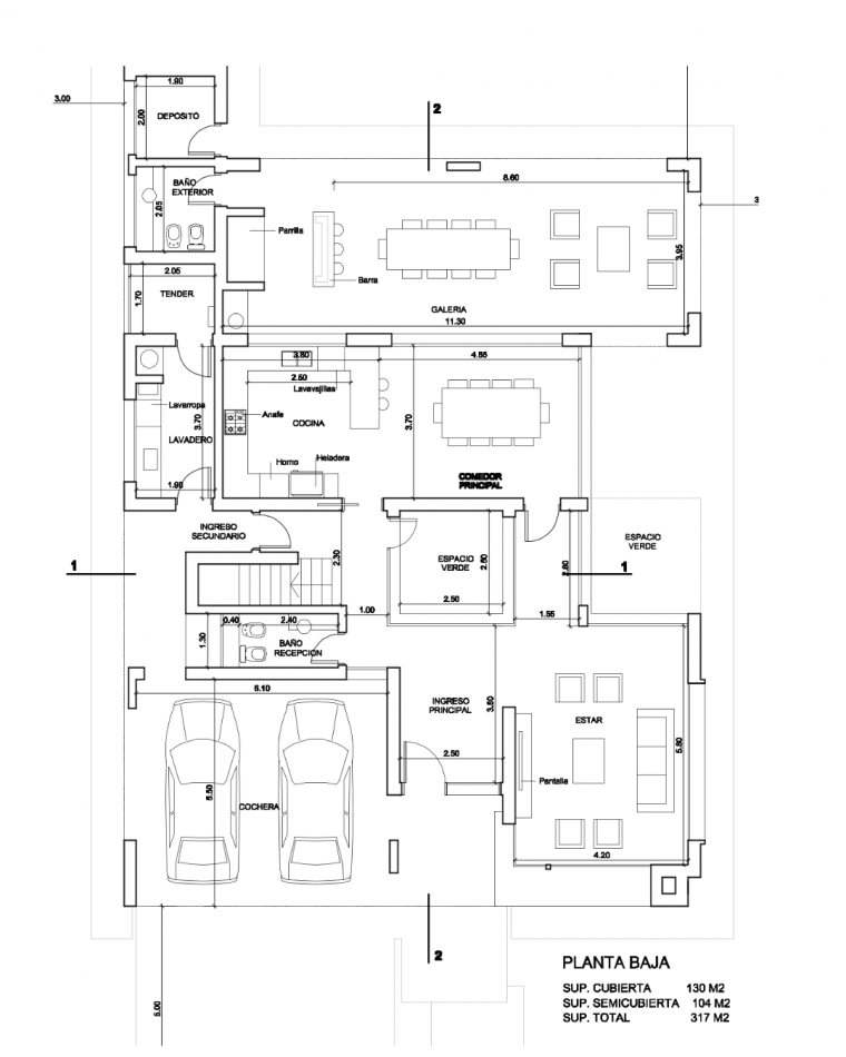 Desarrollada sobre un terreno de 800 m², la casa cuenta con una superficie total construida de 317 m², compuesta por 130 m² cubiertos en planta baja, 135 m² cubiertos en planta alta y 104 m² semicubiertos, logrando una excelente integración entre los espacios interiores y el jardín.