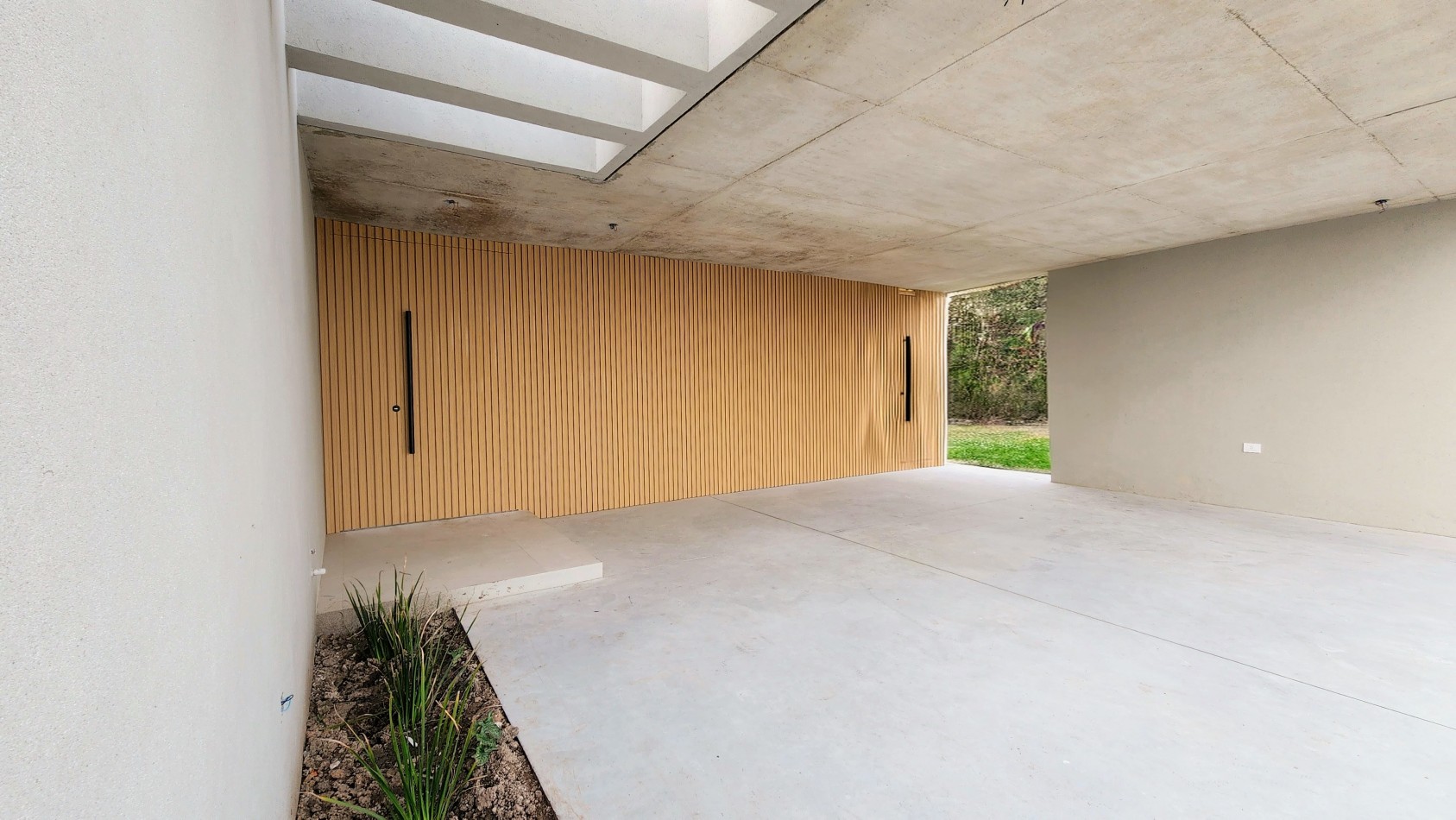 El ingreso cuenta con cochera semi-cubierta para dos autos junto con el ingreso peatonal.
