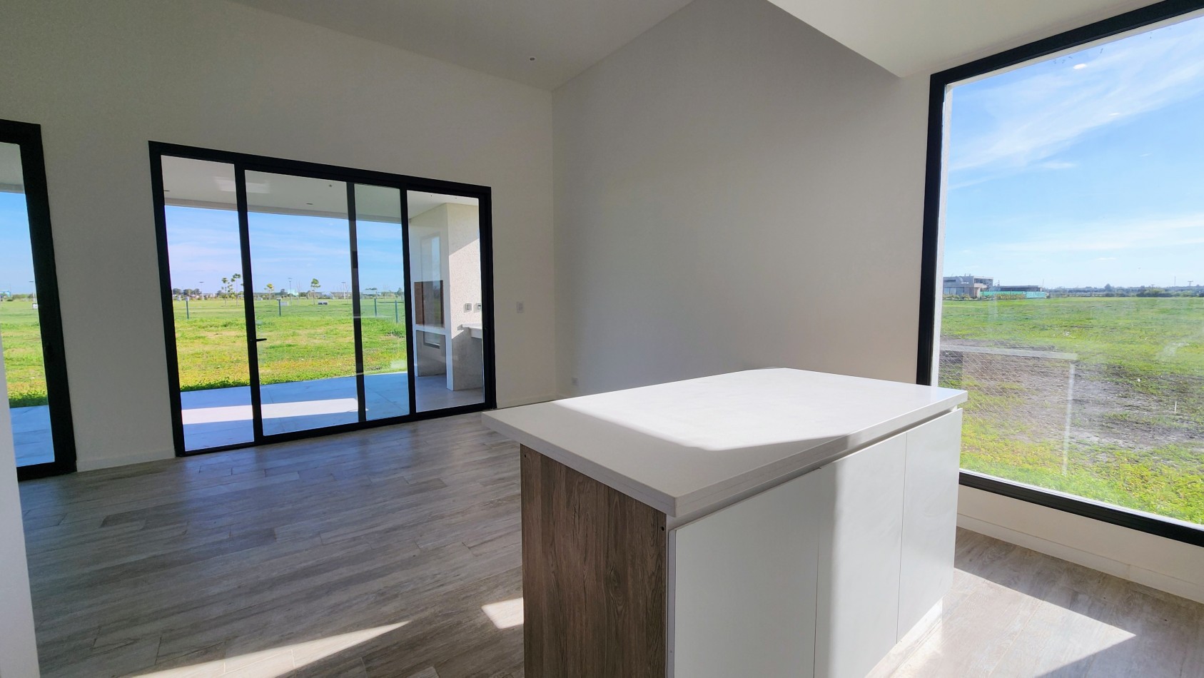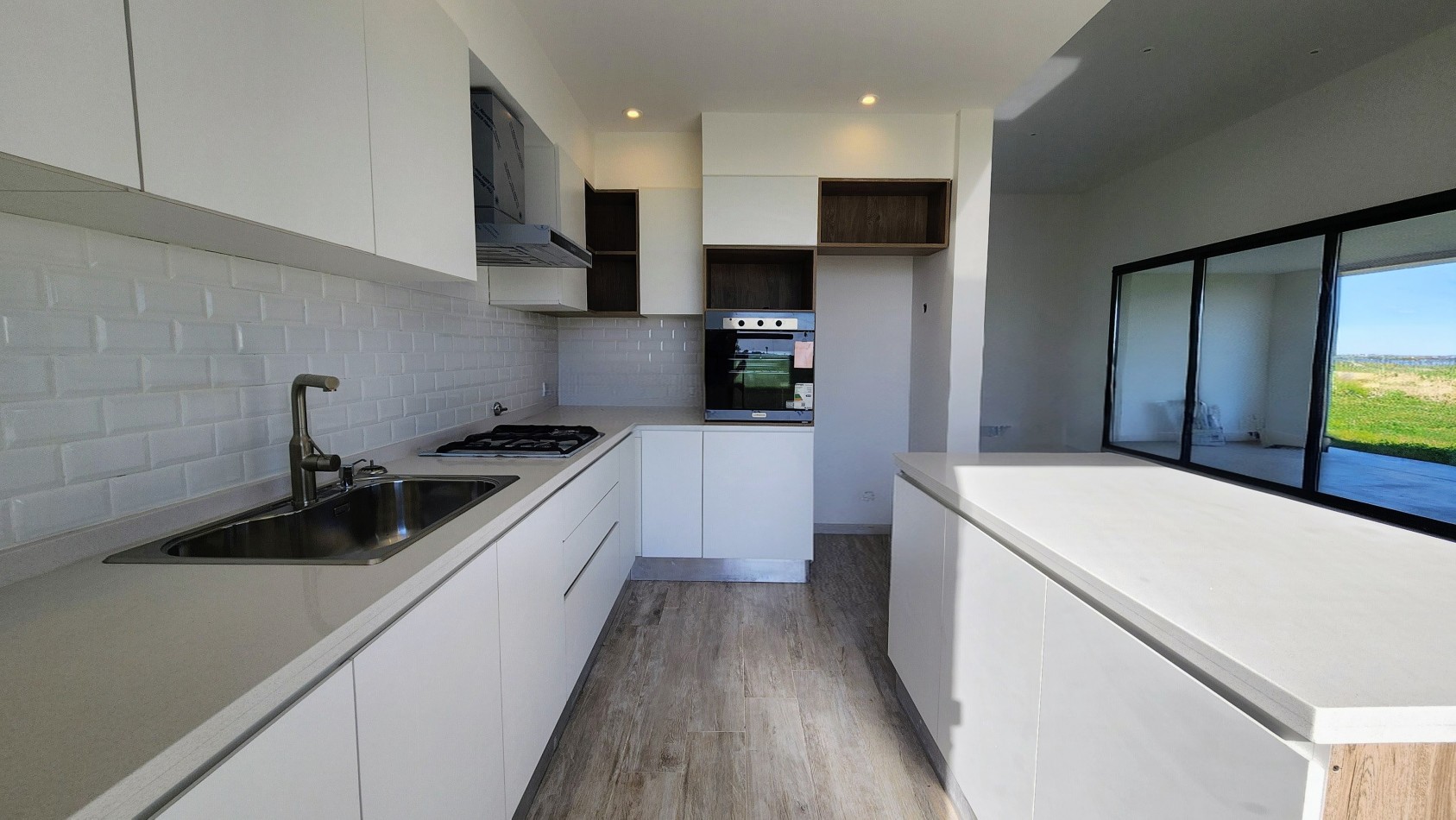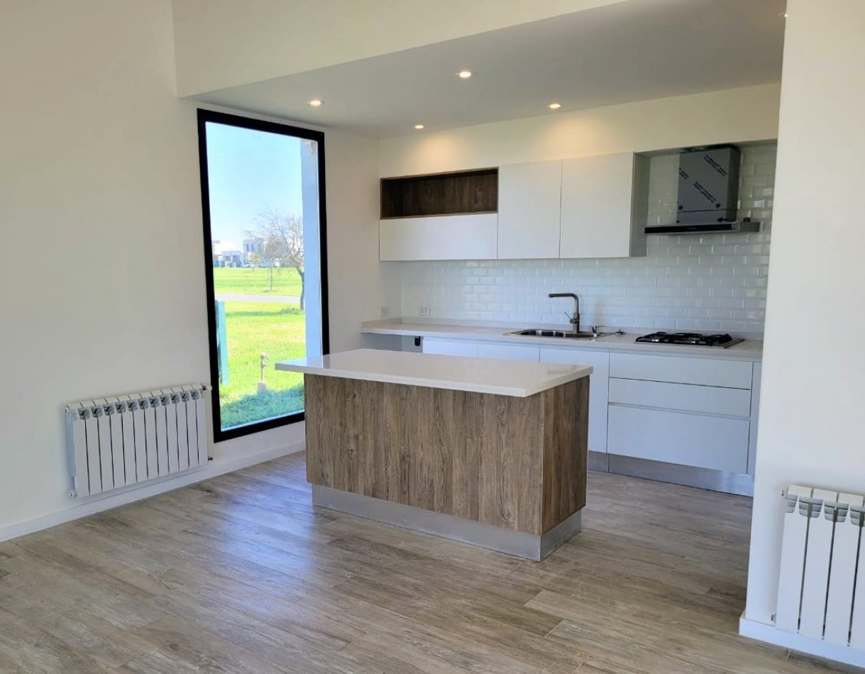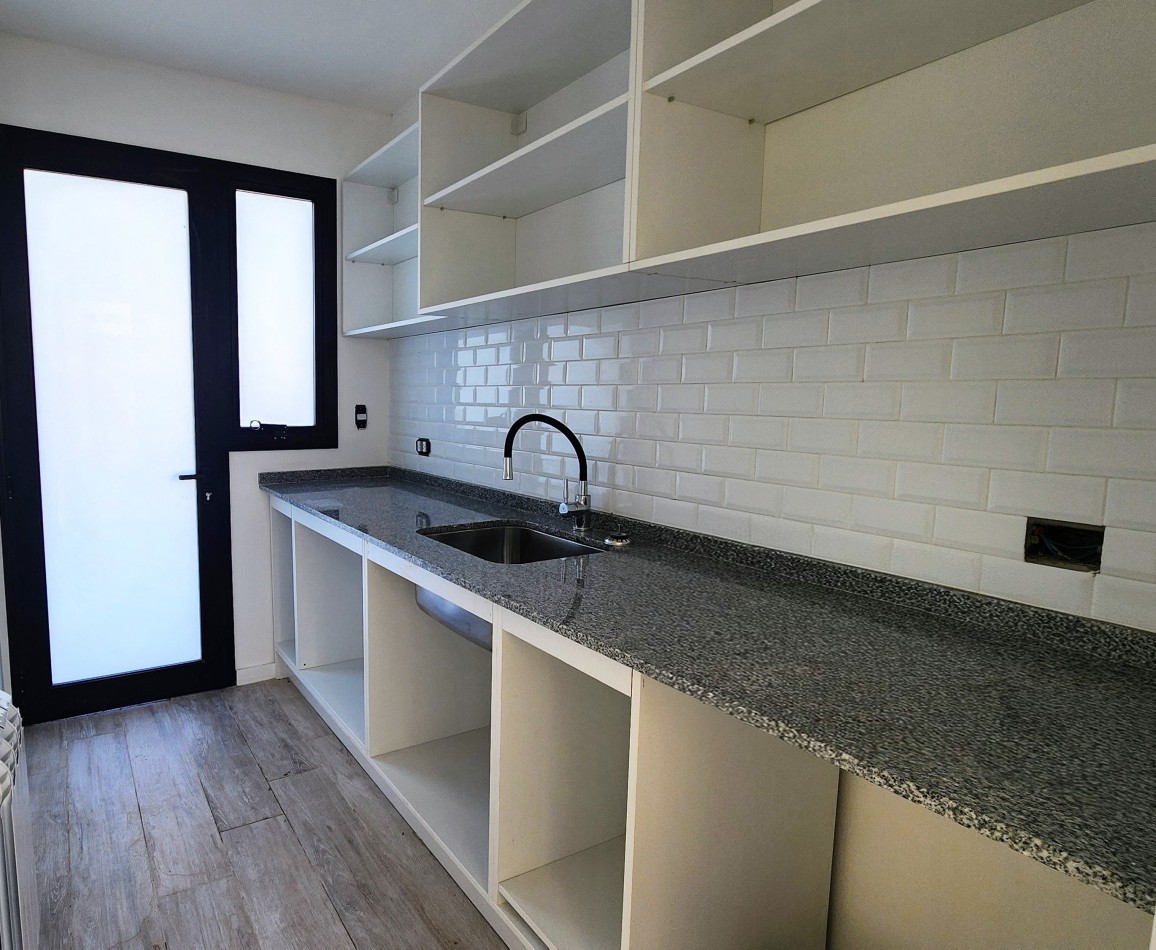 El área de living-comedor y cocina es amplia y luminosa, con un amplio ventanal que da vista hacia la galería semicubierta con gran parrillero. La cocina cuenta con una barra desayunadora.