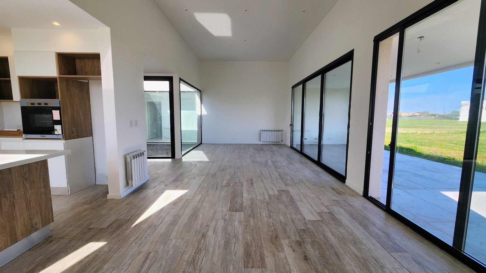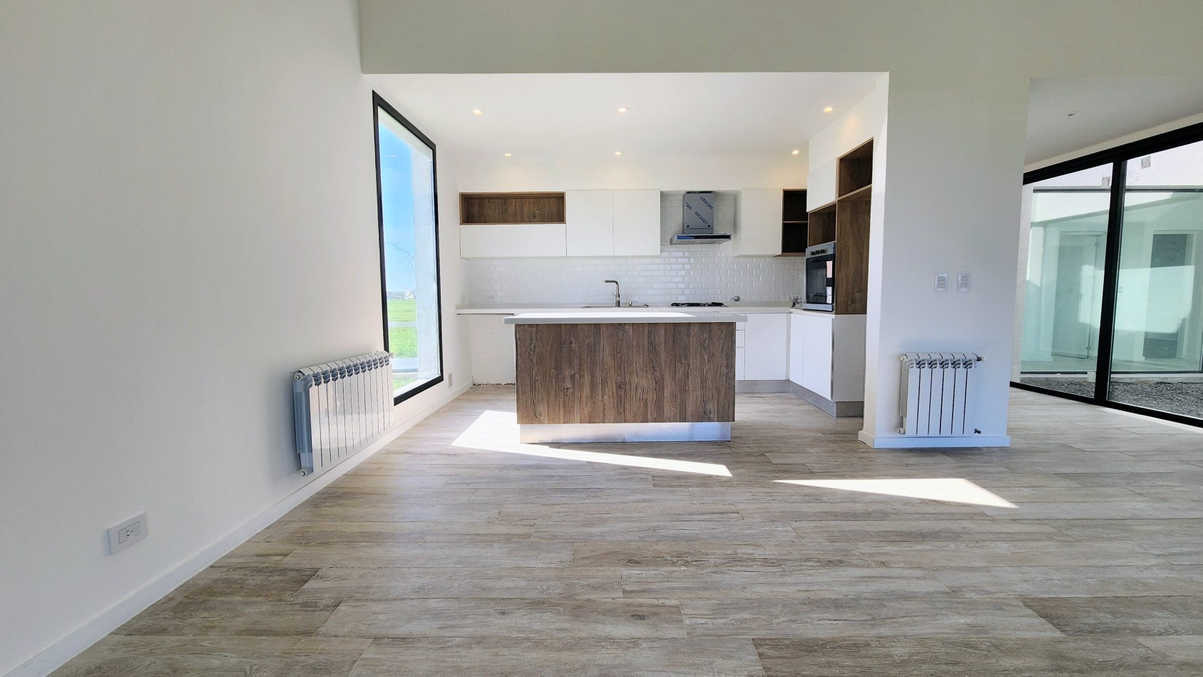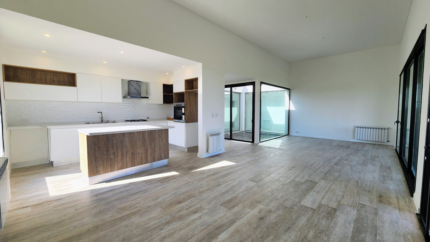 El área de living-comedor y cocina es amplia y luminosa, con un amplio ventanal que da vista hacia la galería semicubierta con gran parrillero. La cocina cuenta con una barra desayunadora.